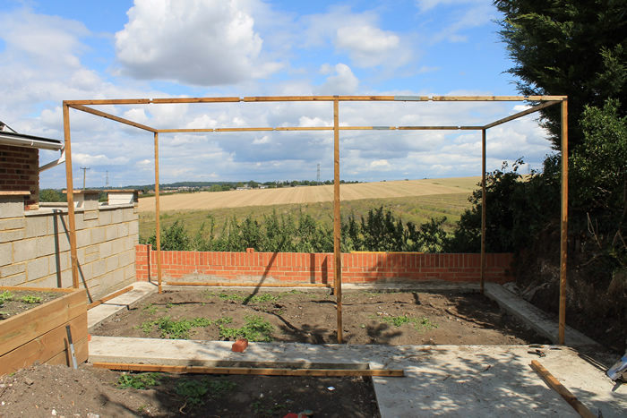 Once the concrete is laid, I erect the basic frame. There are 6 3.4m uprights that are sunk into the ground. Cross-pieces along the top and connectors at the bottom of the uprights are put in place to help get everything aligned and vertical. Everything is pre-cut to size and so ensures that everything is square.