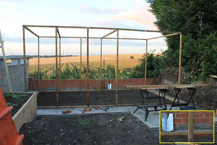 Here, you see the uprights being added. However, there is also a course of bricks laid under the base poles (see the insert bottom left of the image). These support the base poles and provide a neat edge to the structure as well as bringing the wood off the soil.