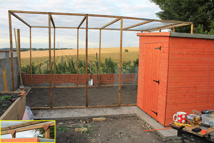 Several things have happened here. Firstly, tea has been replaced by beer! The uprights and roof cross-members are in and the roof now has wire on. As well as stapling the wire in position, there are also additional strips screwed onto each cross-member, holding the wire in place.