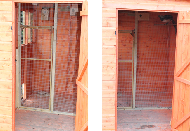 Then there is the shed. This has 2 doors. The one on the right gable that you can see here and one on the front of the shed. This provides 2 things. Firstly, a double door to get in and out of the aviary. Secondly, it provides shelter for the birds. they have access to the shed through it's window and through a hole cut at the bottom.